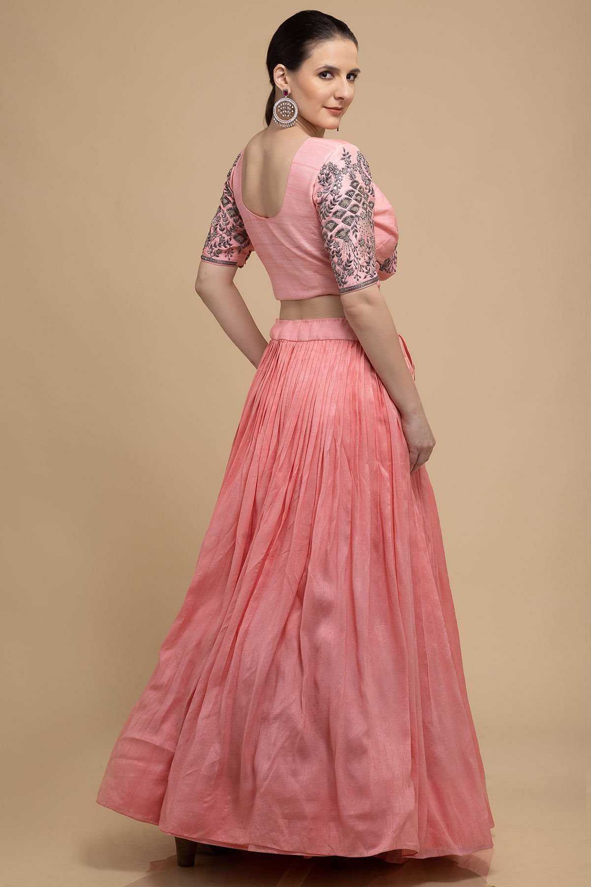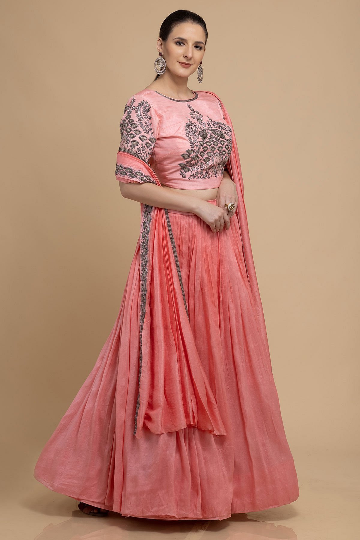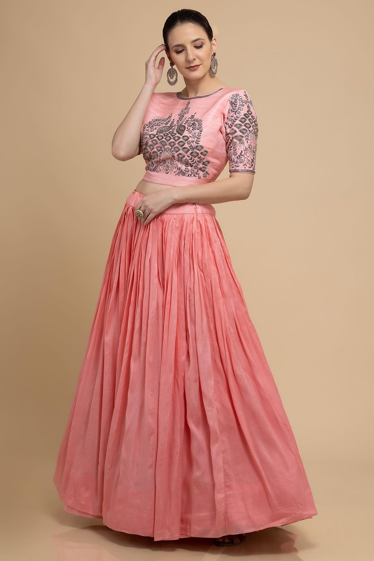Lehenga Choli : Readymade Lehenga Choli Back Neck Pattern : U-Neck Lehenga Choli Color : Coral Pink Lehenga Choli Fabric : Raw Silk Lehenga Choli Front Neck Pattern : Jewel Neck Lehenga Choli Length : 15 Inches Lehenga Choli Sleeves : Elbow Length Lehenga Choli Work : Cutdana, Sequins & Bead Work Lehenga Lining Fabric : Santoon