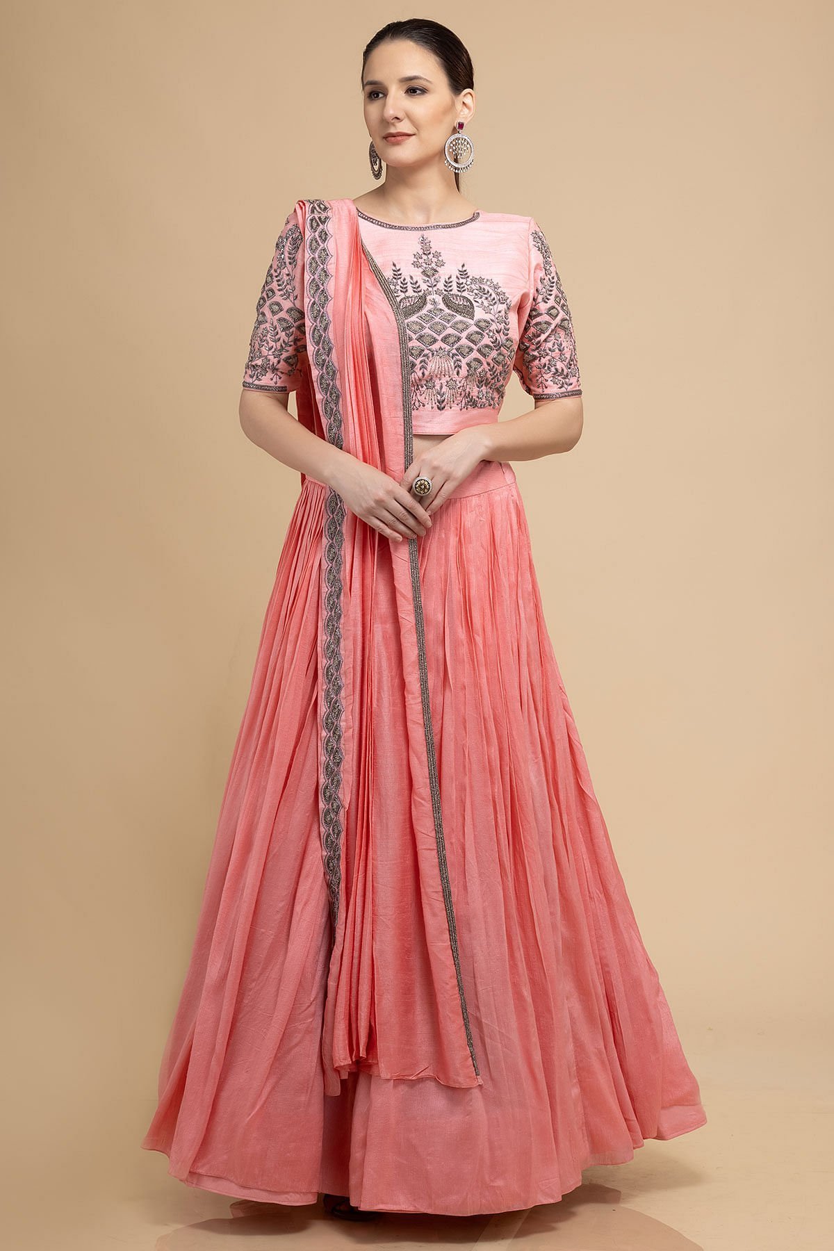 Simple yet captivating lehenga set to style your initimidate celebrations with grace and elegance, hued in Coral Pink crafted from silk ensures a crisp and smart appearance. Features a cutdana, sequins and bead embroidered readymade blouse, gathered skirt and a dupatta. There might be a little color variation in the image and original product due to photographic lighting sources or your monitor settings.