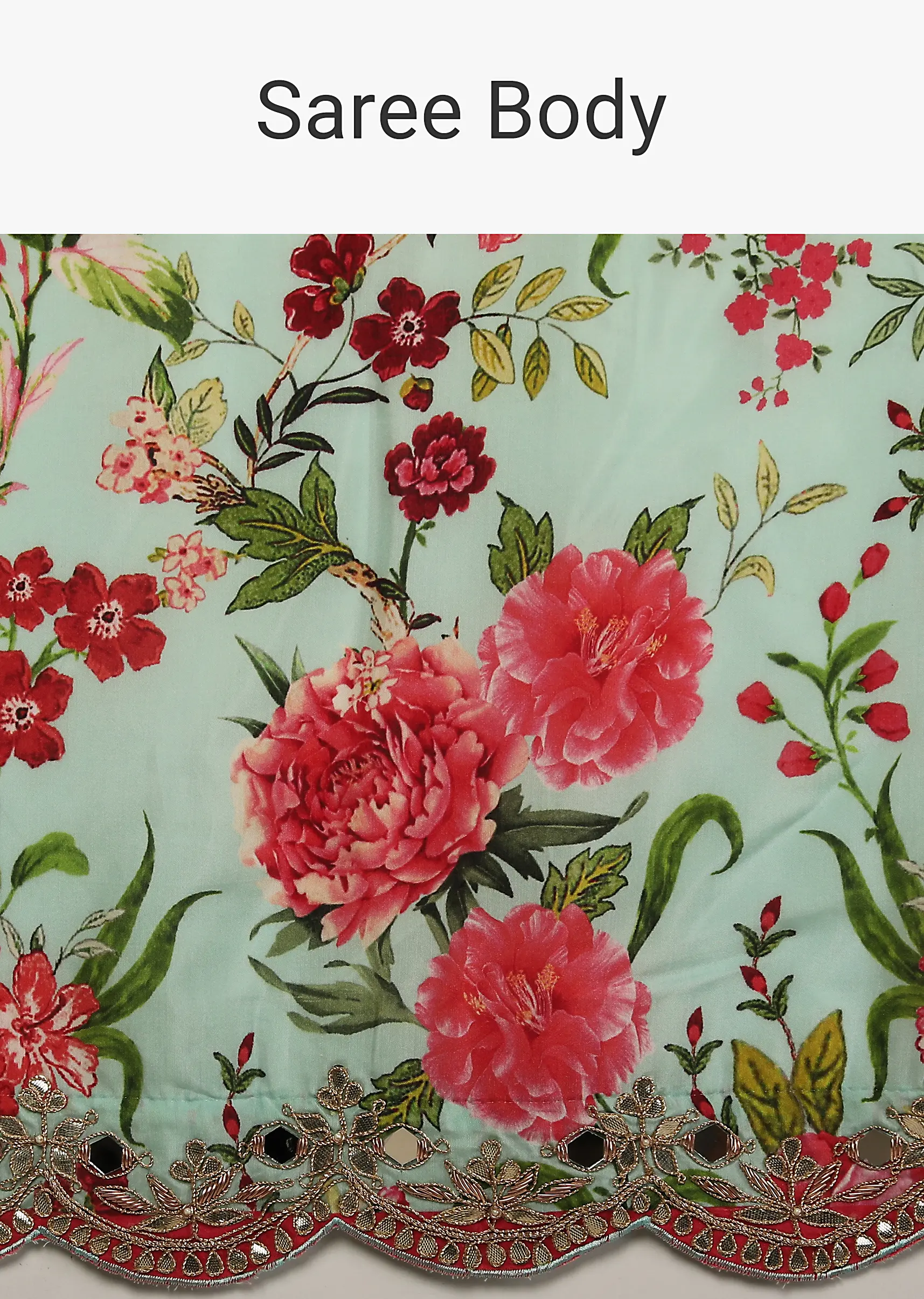 Mint Saree In Cotton Silk With Contrasting Floral Print And Gotta Embroidered Scallop Border