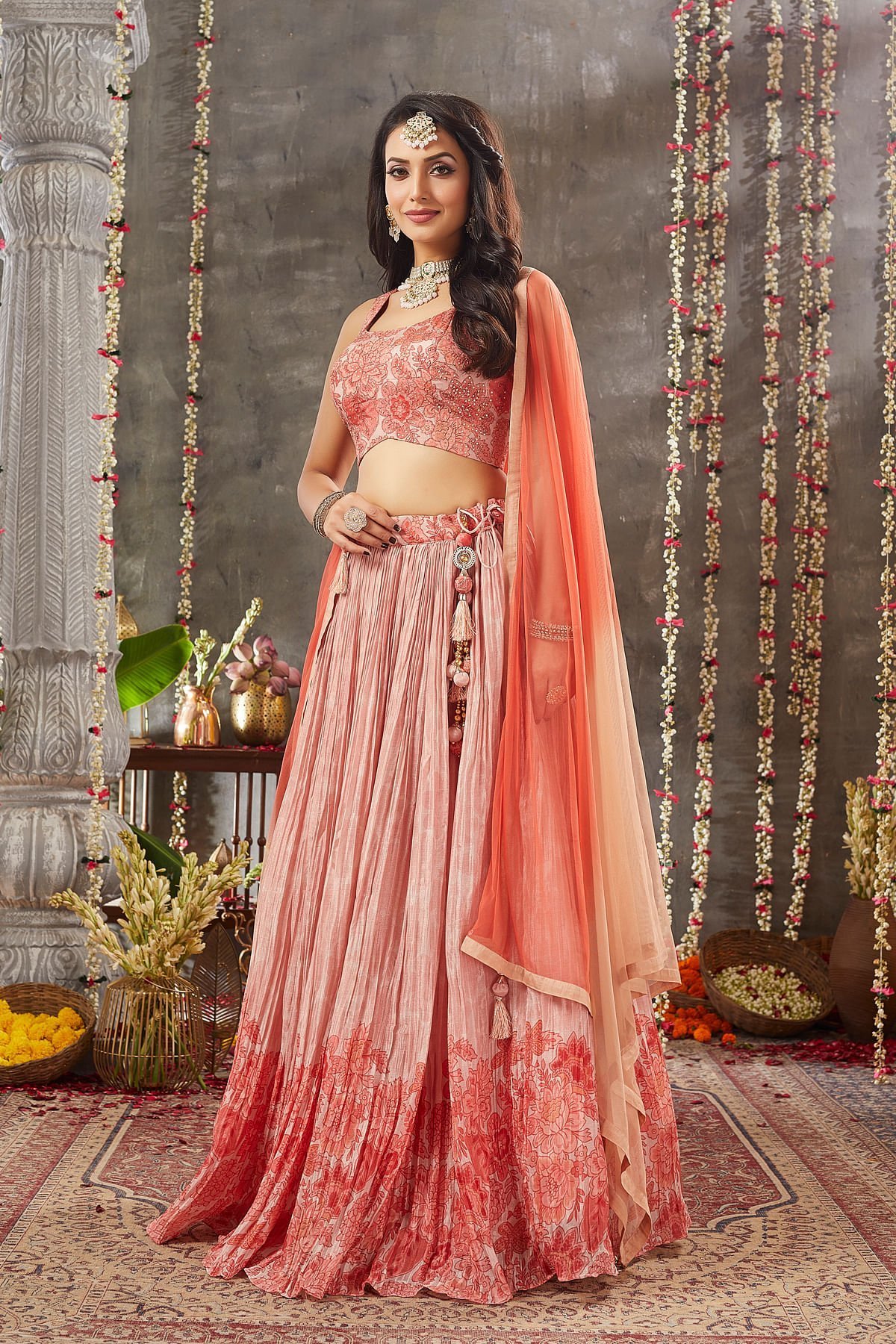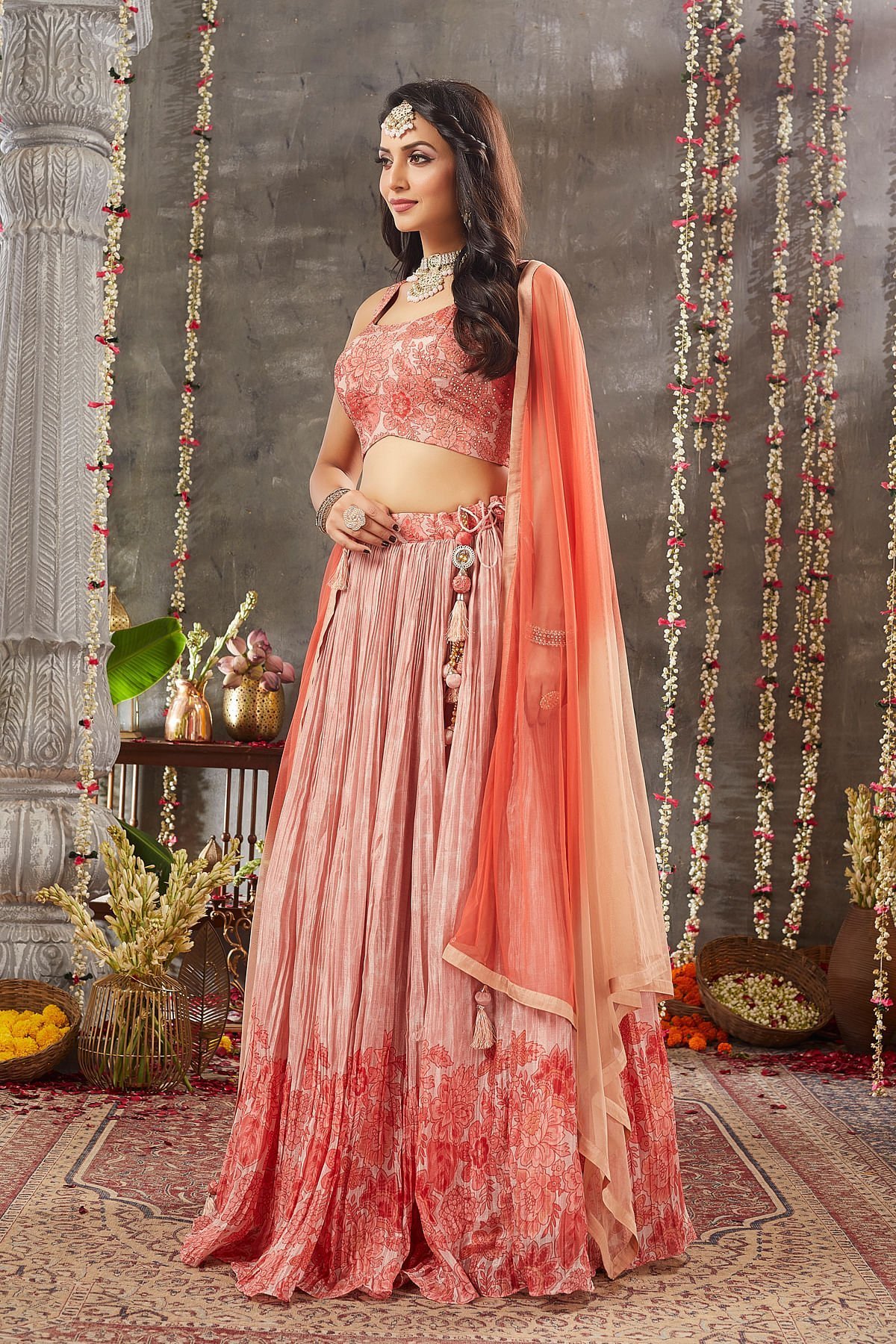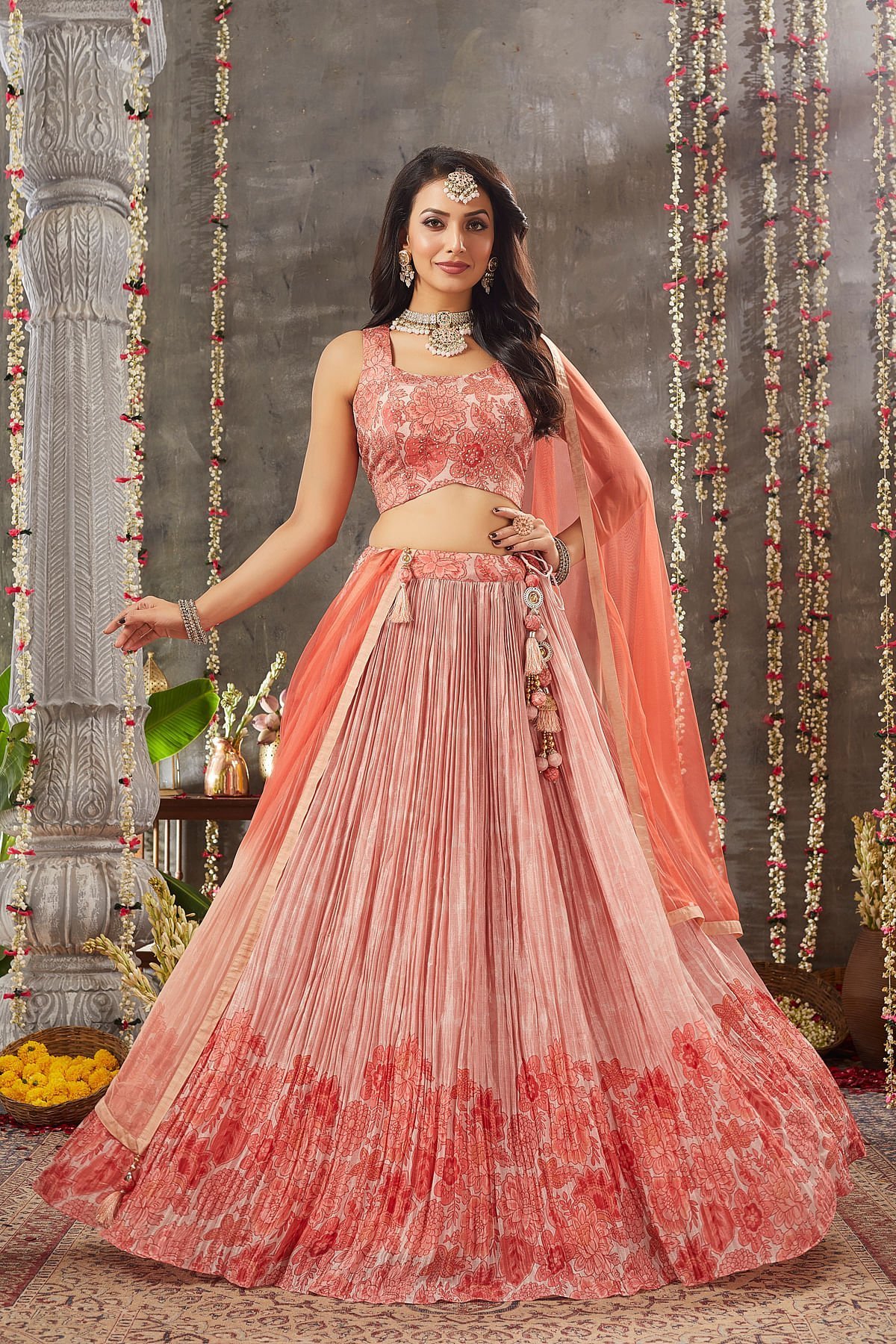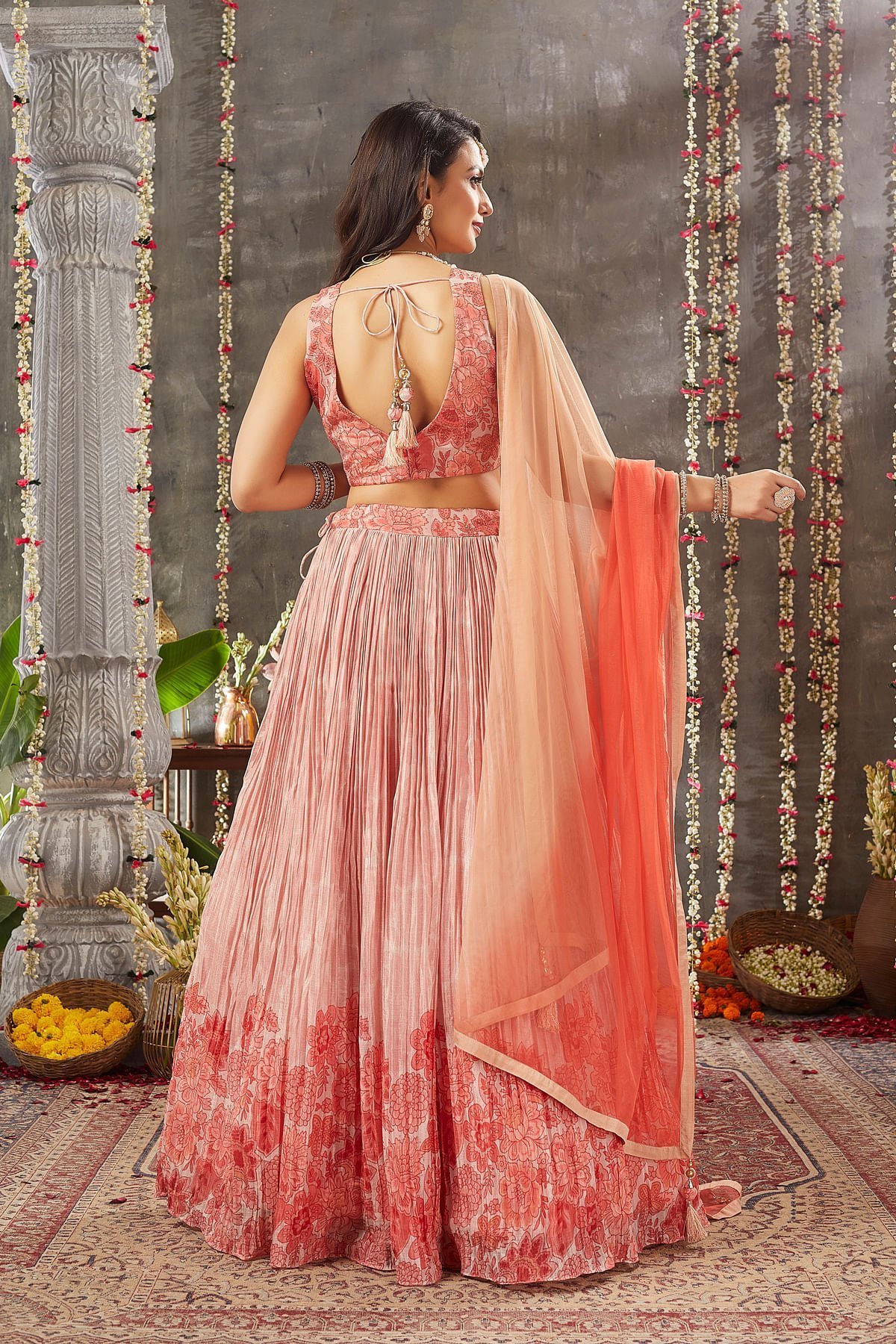 Radiate charm with our Peach Pearl Crepe Lehenga Choli set, perfect for special occasions. The 112 cm gathered Lehenga boasts a Printed design, creating a simple and elegant look. The pure Crepe fabric offers a luxurious feel, and the soft peach pearl color exudes sophistication. The matching Dupatta features a Peach & Orange Ombre color in Net fabric, adding a touch of ombre elegance. The Readymade choli, in a matching Crepe fabric, comes with a U-Neck front pattern, Sleeveless design, and a combination of Printed, Zari, and Sequins work, offering a contemporary twist. Embrace timeless fashion with this stunning outfit, sure to make you the center of attention at any event. Complete the look by wearing Stone jewelry with barcelet and open hair curls hairstyle. There might be little color variations in the image and original product due to photographic lightings or your monitor settings.